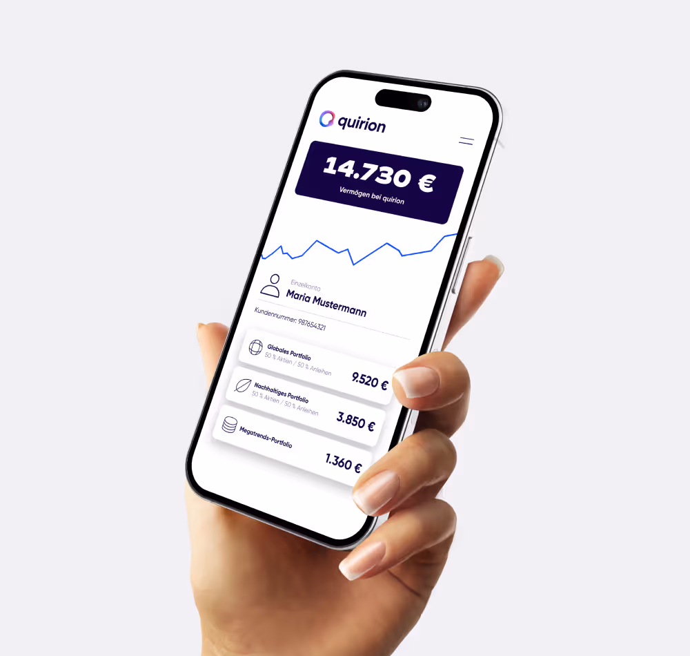 Der ETF-Sparplan-Rechner von quirion basiert auf der Annahme einer 100 %-igen Aktien-Investitionen, mit der die Renditechancen des Kapitalmarktes am besten ausgeschöpft werden können, wenn die damit verbundenen – mitunter auch deutlich stärkeren – Kursschwankungen ausgehalten werden können. Die für das Aktiensparen unterstellte Rendite von 7,96 % p. a. basiert auf der tatsächlichen durchschnittlichen Rendite des MSCI All Country World Index (kurz: MSCI ACWI, in Euro gerechnet, inkl. Dividenden) in den letzten 20 Jahren (Stand: 30.06.2024). Er enthält überwiegend Standardaktien aus den Industrie- und Schwellenländern. Bei der Schätzung wird vereinfachend eine konstante Wertentwicklung über die gesamte Laufzeit unterstellt. In der Realität entwickelt sich eine Aktienanlage aber immer unter – teils starken – Schwankungen, die auch mit temporären Verlusten einhergehen können. Derartige Schätzungen sind kein verlässlicher Indikator für die künftige Wertentwicklung. Bei den angenommenen laufenden Kosten handelt es sich um das quirion-Vermögensveraltungshonorar in der rein digitalen Variante (0,48 % p. a.) zzgl. 0,20 % p. a. ETF-Kosten (sog. Total Expense Ratio, TER).