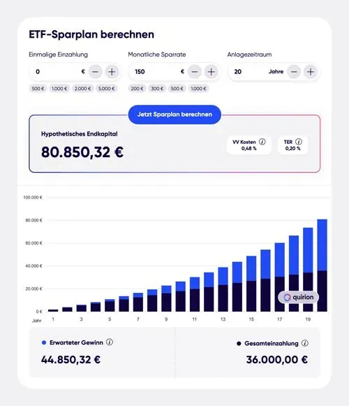 Der ETF-Sparplan-Rechner von quirion basiert auf der Annahme einer 100 %-igen Aktien-Investitionen, mit der die Renditechancen des Kapitalmarktes am besten ausgeschöpft werden können, wenn die damit verbundenen – mitunter auch deutlich stärkeren – Kursschwankungen ausgehalten werden können. Die für das Aktiensparen unterstellte Rendite von 7,96 % p. a. basiert auf der tatsächlichen durchschnittlichen Rendite des MSCI All Country World Index (kurz: MSCI ACWI, in Euro gerechnet, inkl. Dividenden) in den letzten 20 Jahren (Stand: 30.06.2024). Er enthält überwiegend Standardaktien aus den Industrie- und Schwellenländern. Bei der Schätzung wird vereinfachend eine konstante Wertentwicklung über die gesamte Laufzeit unterstellt. In der Realität entwickelt sich eine Aktienanlage aber immer unter – teils starken – Schwankungen, die auch mit temporären Verlusten einhergehen können. Derartige Schätzungen sind kein verlässlicher Indikator für die künftige Wertentwicklung. Bei den angenommenen laufenden Kosten handelt es sich um das quirion-Vermögensveraltungshonorar in der rein digitalen Variante (0,48 % p. a.) zzgl. 0,20 % p. a. ETF-Kosten (sog. Total Expense Ratio, TER).