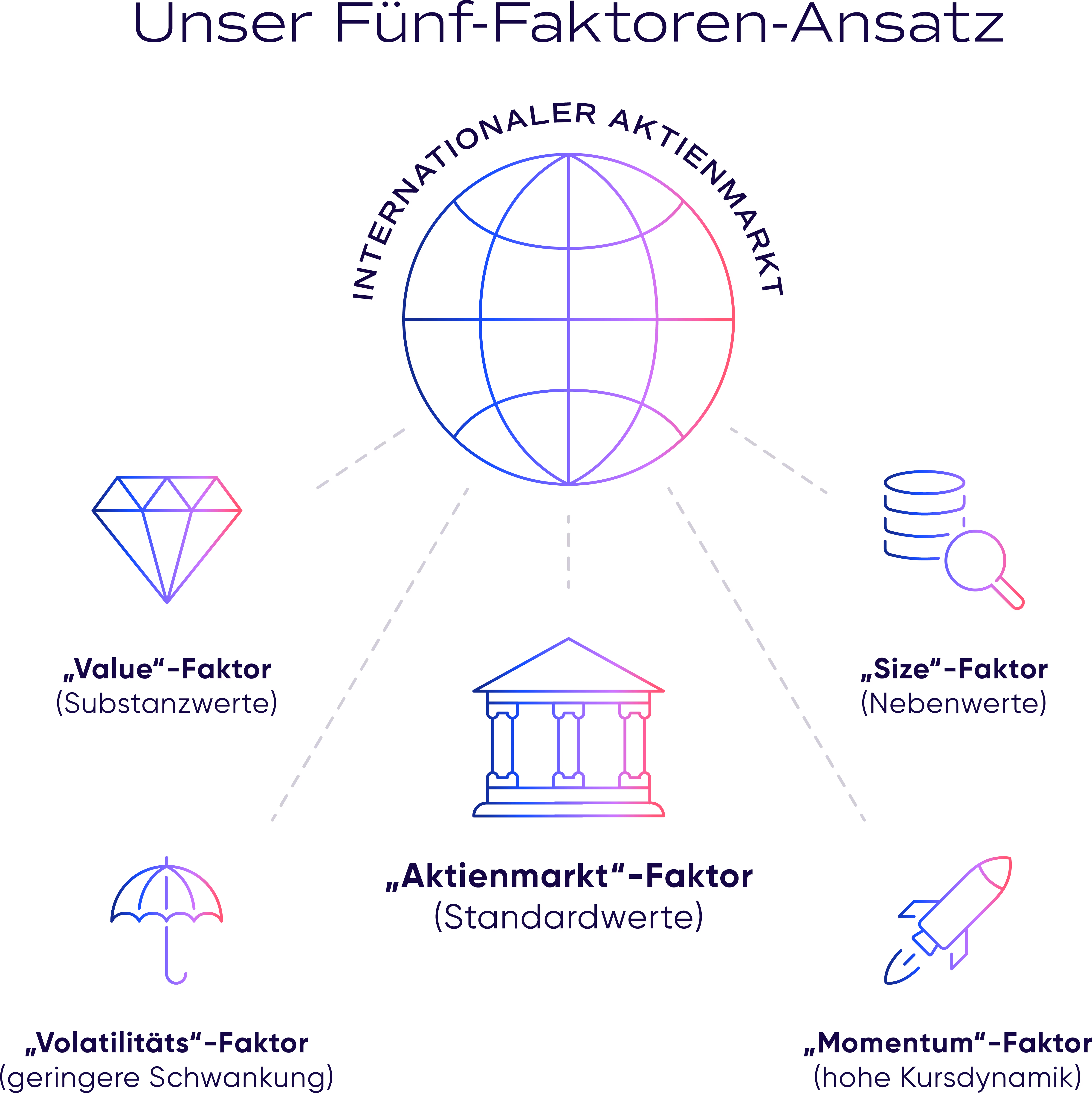 Fünf Faktoren sind es, an denen sich auf der Aktienseite die Produktauswahl von quirion orientiert, ob für das globale oder das nachhaltige Portfolio. Nach wissenschaftlich fundierten Analysen ist der Weg über diese Faktoren der effizienteste, um die Diversifizierung auf die Spitze zu treiben – und so zu einem möglichst optimalen Rendite-Risiko-Verhältnis zu kommen.