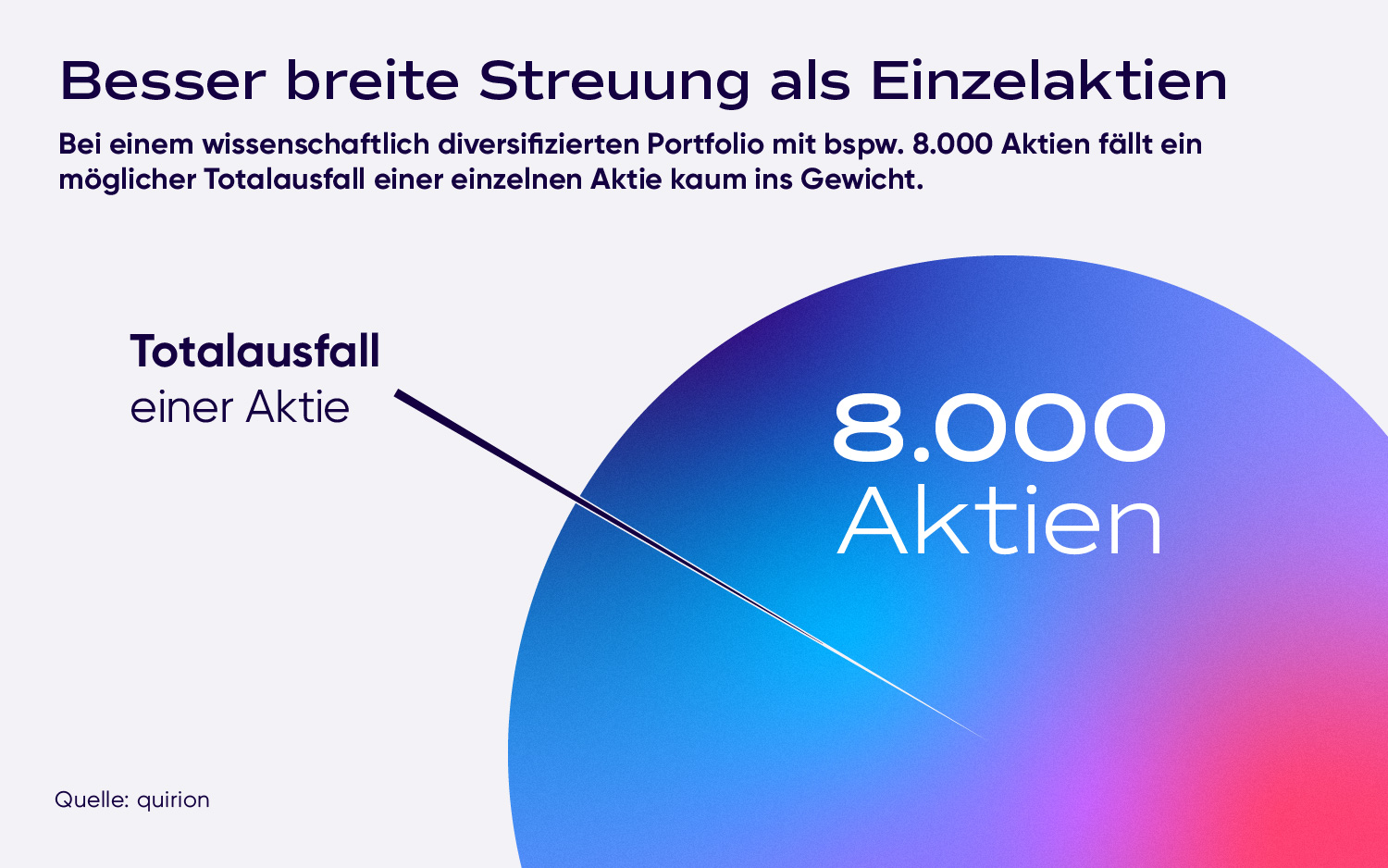 Die Geldanlage in Aktien birgt verschiedene Risiken: Einzelne Unternehmen können ausfallen, einzelne Branchen und Regionen in längere Krisen geraten. Deshalb sollte man bei der Geldanlage in Aktien das Portfolio möglichst breit streuen. Das globale ETF-Portfolio ist nach wissenschaftlichen Kriterien diversifiziert und enthält rund 8.000 Aktien aus über 70 Ländern. So nutzt man die Renditechancen der Anlageklasse, ohne unnötige Risiken einzugehen.